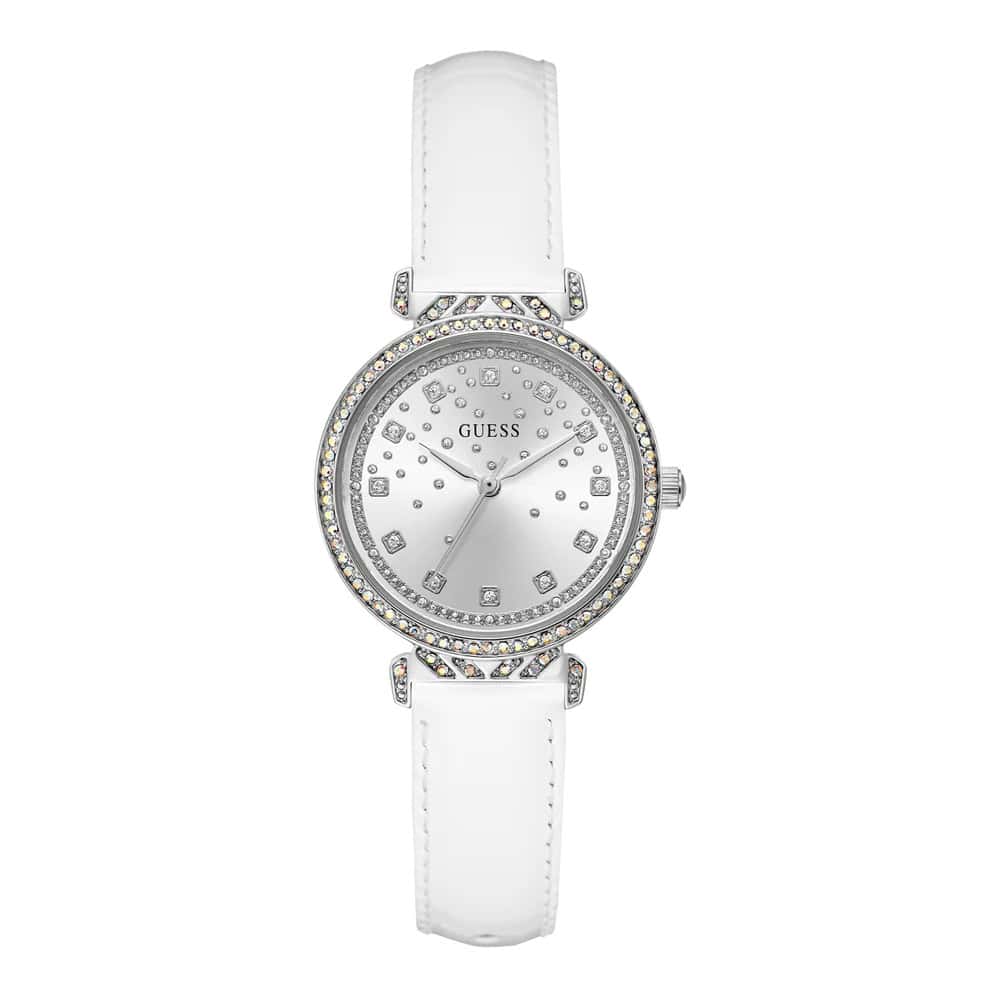 Guess Enchantment női karóra GW0764L4 Rozsdamentes acél tok, ezüst színű bevonattal, polírozott bőr szíjjal, fehér, tűs csattal – Kvarc szerkezet, elemes működésű – Vízálló – Kövekkel díszített tok és számlap – Számlap színe ezüst – Tok szélessége kb. 32 mm – Tok magassága kb. 7 mm – Dobozával és információs kártyával együtt. Környezetvédelmi okokból a kezelési útmutató és további információk csak a gyártó weboldalán érhetők el!