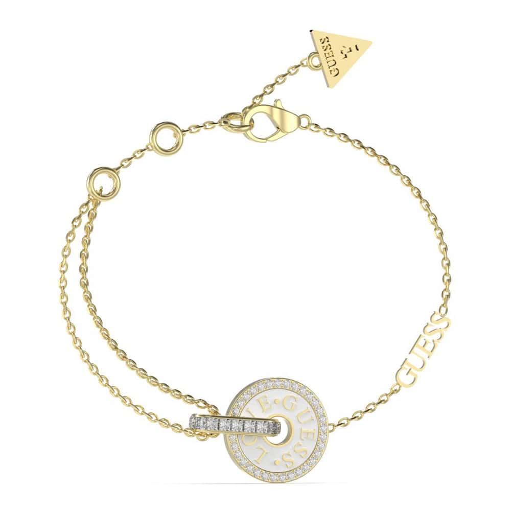 Guess női karkötő JUBB04078JWYGWHL – Rozsdamentes acél – Arany színű / Fehér – Kövekkel kirakva – Női standard méret L – Guess táskával együtt.