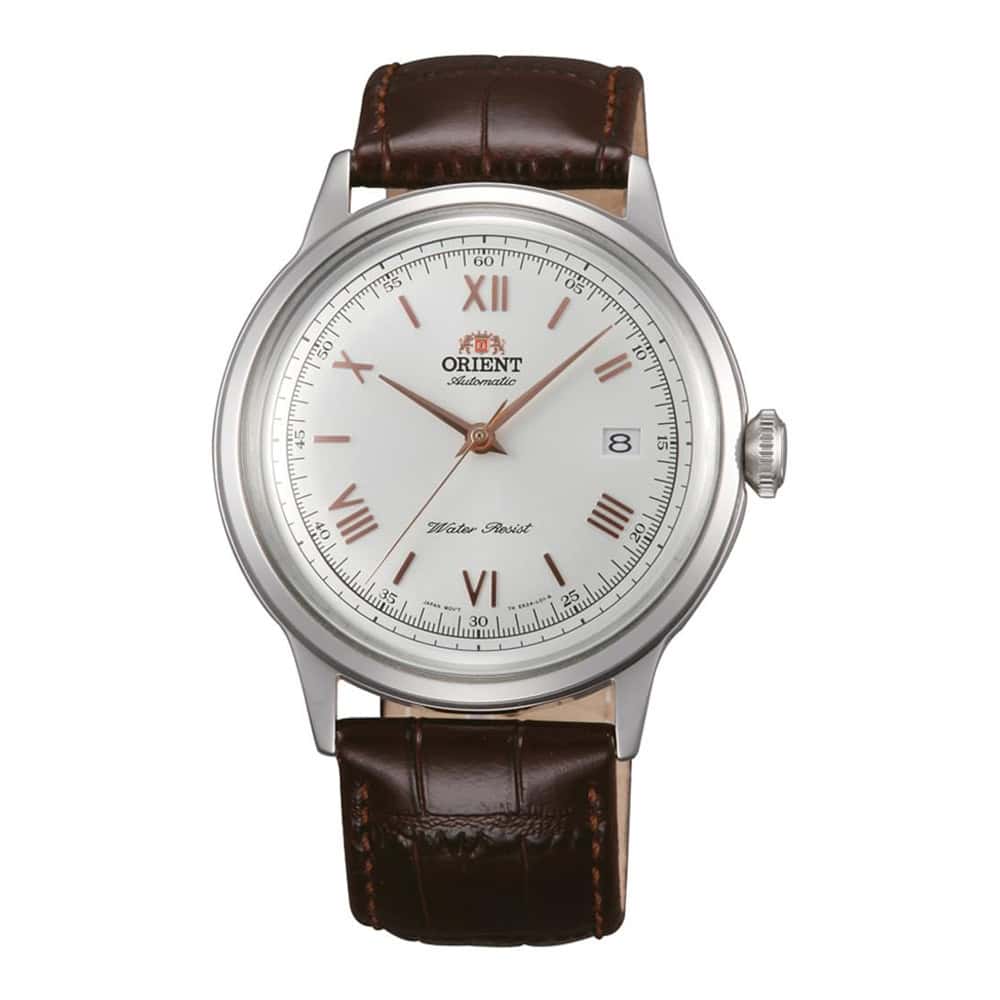 Orient Bambino Automatic TAC00008W0 férfi karóra – Rozsdamentes acél tok, ezüst színű bevonat, polírozott/matt bőr szíj, barna, tűs csat – Automata szerkezet – Dátumkijelzés – Számlap színe ezüst – 50 méterig vízálló – Tok szélessége kb. 40 mm – Tok magassága kb. 10 mm – Dobozával együtt érkezik.