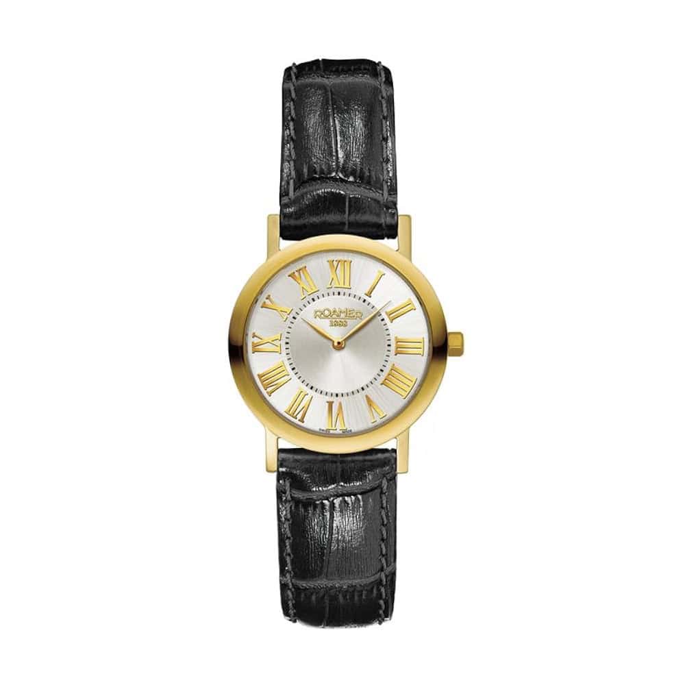Roamer Limelight Gents 9340004811SEM férfi karóra – Rozsdamentes acél tok, arany színű bevonat, polírozott bőr szíj, fekete, tűs csat – Zafír üveg – Kvarc szerkezet, elemes működésű – Dátumkijelzés – 3 ATM vízálló – Számlap színe ezüst – Tok szélessége kb. 38 mm – Tok magassága kb. 5 mm – Fűzékkel és dobozzal együtt.